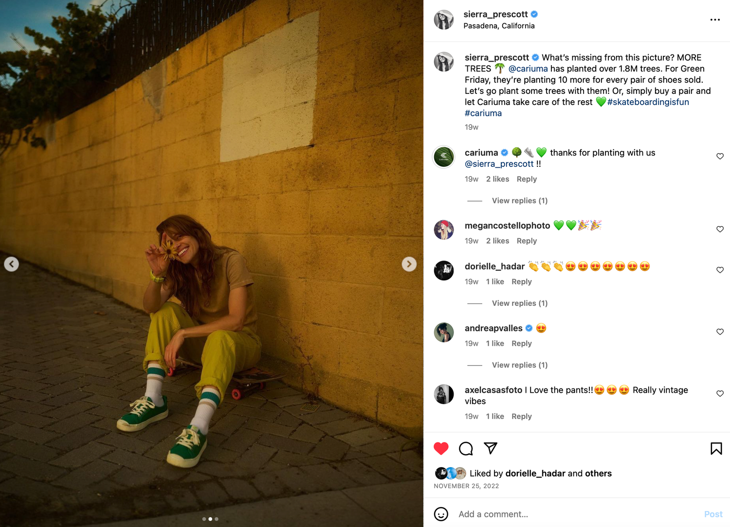 Coordinated monthly social media campaigns with all ambassadors and the Cariuma surf team across Instagram, TikTok and Youtube in line with product launches and initiatives. For Cariuma’s Green Friday campaign below, the Cariuma surf team and ambassadors posted across their social channels sharing Cariuma’s pledge to plant 10 trees per each pair of shoes purchased.